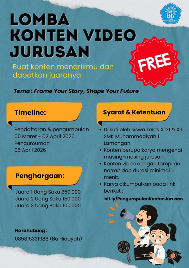 Buat kalian para kreator konten di sekolah, inilah saatnya pamer skill! SMK Muhammadiyah 1 Lamongan resmi membuka ajang “Lomba Konten Video Jurusan” dengan tema keren: “Frame Your Story, Shape Your Future”.